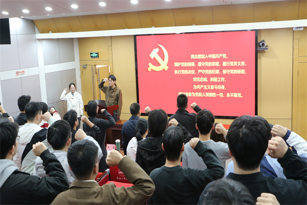在研究生第一党支部书记李春阳同志的带领下,全体与会党员重温入党誓词,铿锵有力的誓言在报告厅内回荡,表达了全体党员为共产主义事业奋斗终身的坚定信念和决心。